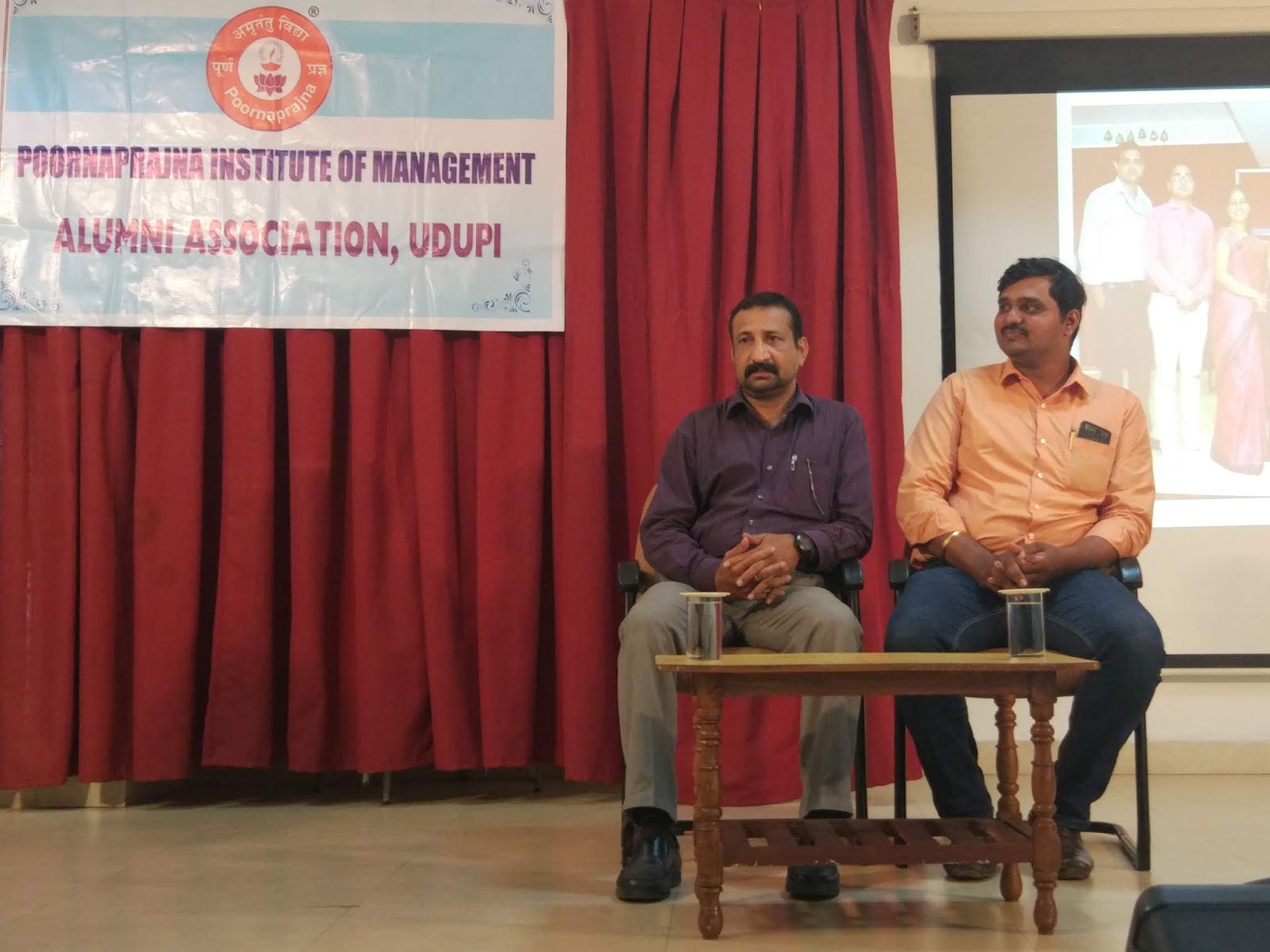 The programme began at 12pm with Ms.Priya Poojary 2nd year MBA student as the master of ceremony for the programme. Priya gave a brief introduction of Mr. Badhya to the audience. Umesh Badhya was initially selected in the campus recruitment drive of Vijaya Bank and was recruited as Assistant Manager. He worked in the Bank for 3 years. Later, he felt the bank job monotonous in nature and resigned from the bank job in search of challenging assignments which would utilize his potential to the best extent. He soon was acquired by Udaya Group of Industries as Accounts Manager in the year 2013. In 2016, he was promoted as 'General Manager' of Udaya group of Industries due to his sheer intelligence and hard work. His entrepreneurial abilities have prompted him to start his own shop 'Upasana' which caters to the Pooja requirements. Dr. Bharath recalled that Mr. Umesh as a student was humble sincere and was very good at extracurricular activities. The skit directed and played by him along with his classmates is still fresh in the minds of all the teachers who taught him. He was also very good at beating drums and is a member of a professional band of drummers. As an alumnus just like his senior Mr.Girish Aithal, Mr. Badhya has a lot of love and affection towards PIM and he is here to discharge his responsibilities as alumnus said Dr. Bharath. The programme concluded with Ms. Nishitha Sadashiva Salian proposing vote of thanks. The programme was attended by students of both first and second year MBA.