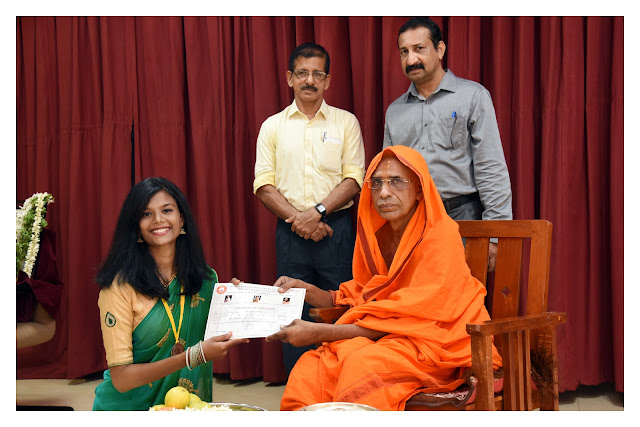 His Holiness felicitated the rank holders, achievers and student leaders who toiled for the NAAC Process, the winners of various competitions, indoor and outdoor. The Swamiji also felicitated Sri Anantajit Tantri, who developed the website of the Institute, Mr. Varun, Miss Sahana. Dr. Sureshramana Mayya introduced Ananthajith Tantri and gave a detailed account of contributions of Anantajith Tantri. Miss Jacqueline Nikitha was the Master of Ceremony. Dr. Bharath, the Director of the Institute, presented the list of persons who contributed towards the quality initiatives of students. Dr. Bharathi Karanth, the NAAC Coordinator and Senior Faculty of the Institute coordinated the entire programme and also hosted the special lunch to all the students and faculty at noon.