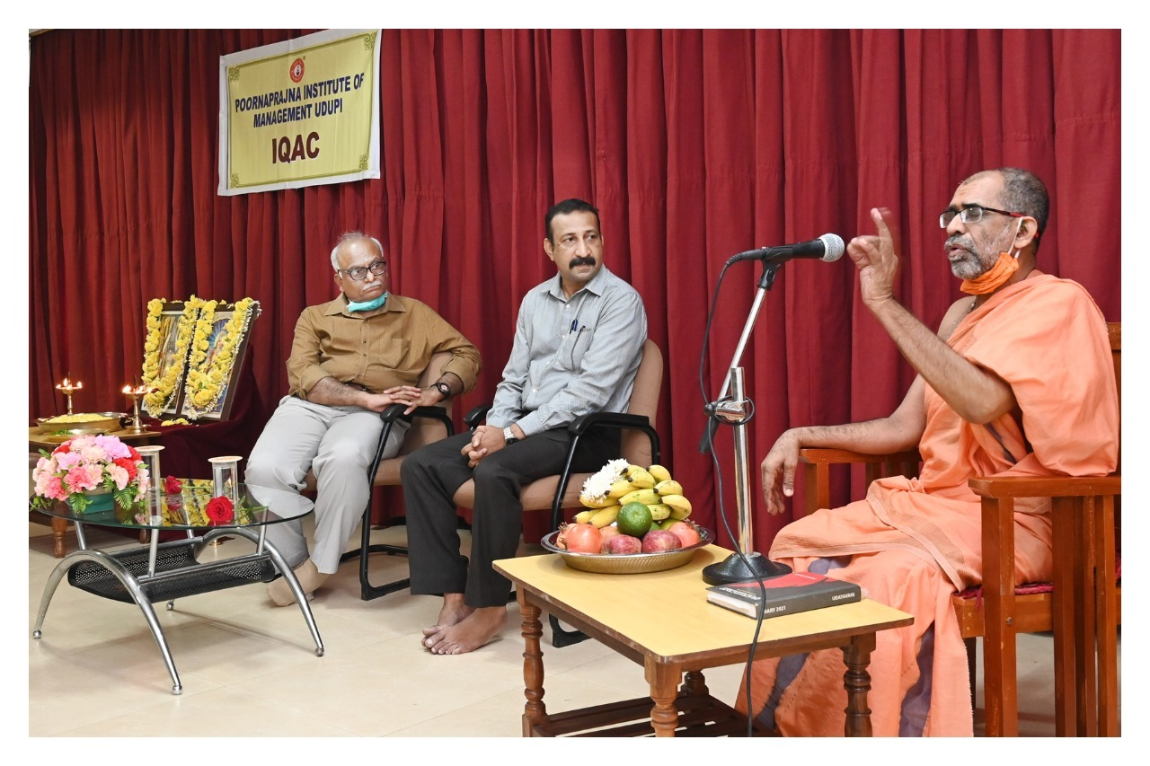 As a part of tradition and culture of PIM Sharada Pooja was conducted on 7th Oct 2021 at Poornaprajna Institute of Management, to invoke the blessings of Devi Sharada Matha, goddess of knowledge. His Holiness Sri Vishwapriya Theertha Swamiji , president of Sri Admar Matt Education Council and the Chairman of our Institute performed the pooja and blessed the students and staff of PIM. Addressing the gathering Swamiji explained the meaning of saraswathi mantra and the relevance of conducting Sharada Pooja every year. Speaking on the occasion, Dr G S Chandrashekar, Medical Director of Adarsha Hospital and Secretary of our Institute threw light on the challenges faced by the Institute and students during the pandemic. Students who brought laurels to the Institute through academic achievements were felicitated by Swamiji. Prizes were distributedto the winners of various games and sports events. Dr Krishna Kothai, Co-ordinator of Poornaprajna Centre for Research and Development was also present. Dr. Bharath. V, Director of the Institute welcomed the gathering. Ms. Anusha, Ms. Sharvya, Ms. Vinaya of I MBA rendered the invocation and Mr. Imran of I MBA proposed vote of thanks. Mr.Naveen Bhat of I MBA was the master of ceremony. Mrs. Sujatha G L, Assisstant Prof and Mr. Srihari Rao, Office Manager, co-ordinated the program.
